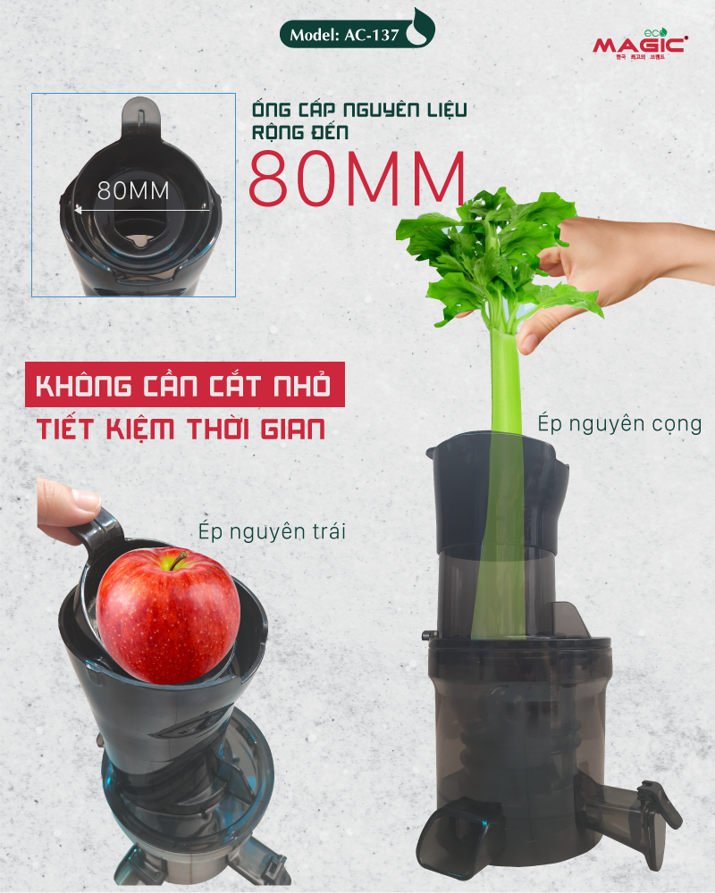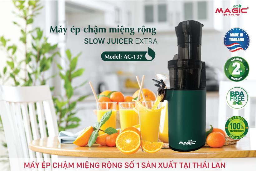 Máy ép chậm miệng rộng Thế hệ mới Magic Eco AC – 137 là một trong những dòng máy ép chậm có ống ép lớn và tốt nhất trên thị trường hiện nay. Máy không chỉ đáp ứng được nhu cầu ép vắt kiệt bã trái cây rau củ của người sử dụng mà còn có thiết kế tinh gọn và thông minh. Tìm hiểu về mẫu máy ép chậm thông minh này qua những thông tin dưới đây nhé.